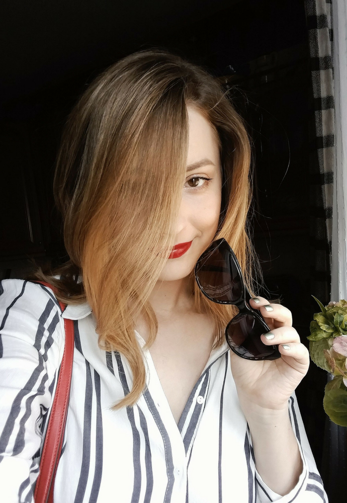 You guys, I did something very drastic this summer! [if you follow me on IG you already know what it is, hehe] While visiting my family in Russia, I went to a local hairdresser and told him to chop off most of my hair, leaving it shoulder length at most. He reluctantly followed my wishes and chopped off the length, and I couldn’t be happier with the result! I also felt like changing up my hair color a bit and wanted to go a little lighter. In the end we decided on foilyage which will make my hair look amazing while it grows out. Foilyage is a technique that is recommended to deep brunettes, because traditional balyage might look too orange on us. The hair stylist still uses bleach to paint the hair, and then wraps the strands in foil to intensify the effect, resulting in lighter streaks.