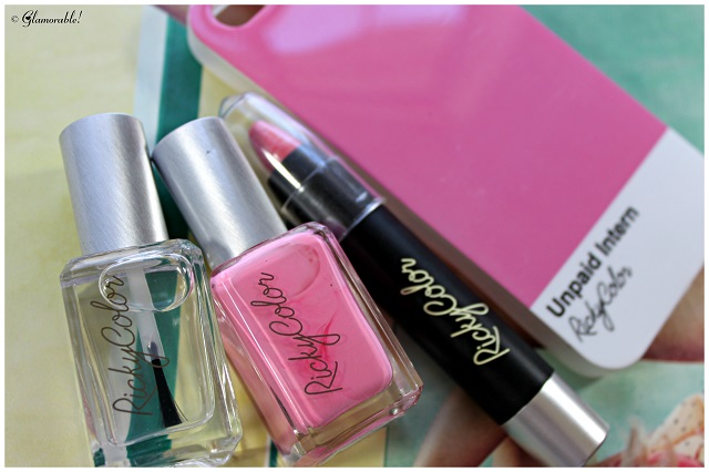 The kit contains four products: iPhone5 Case with “Unpaid Intern” color print, RickyColor nail polish in “Unpaid Intern”, RickyColor Topcoat nail treatment, and RickyColor City Stick in “Unpaid Intern”.