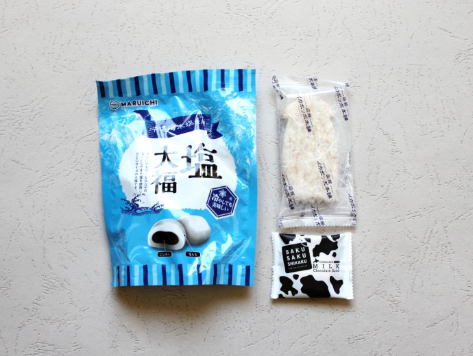 9 // Maruichi Confectionery Okinawan Salt Daifuku – Who else loves getting a whole bag of mochi in your box of snacks? These daifuku have an unusual flavor: soft and chewy mochi dough that is a little bit salty meets a sweet red bean paste heart in the middle. I liked the white and blue packaging, too, because it looks very wintery.