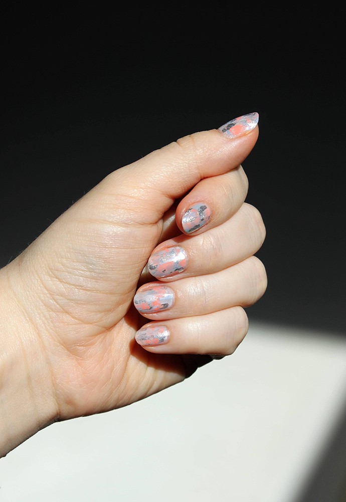 I started by trying on a group of polishes one by one and noticed that they actually look good together. I don’t even know what to call this design. A silvery-blue tie-dye? Abstract splatter? Hand-marbling? Messy brush strokes? That last one is probably the closest, considering I didn’t use any particular techniques – just brushing the colors here and there and setting everything with some topcoat.