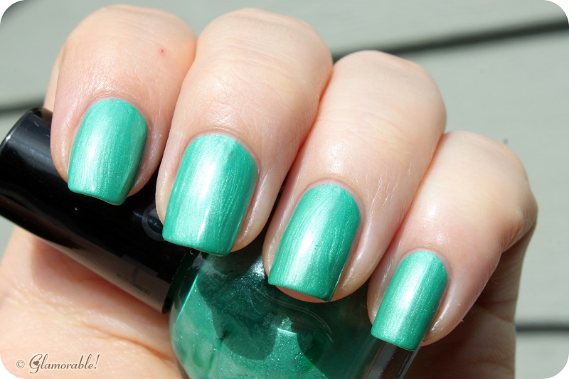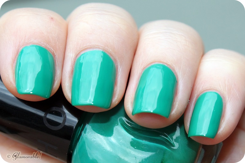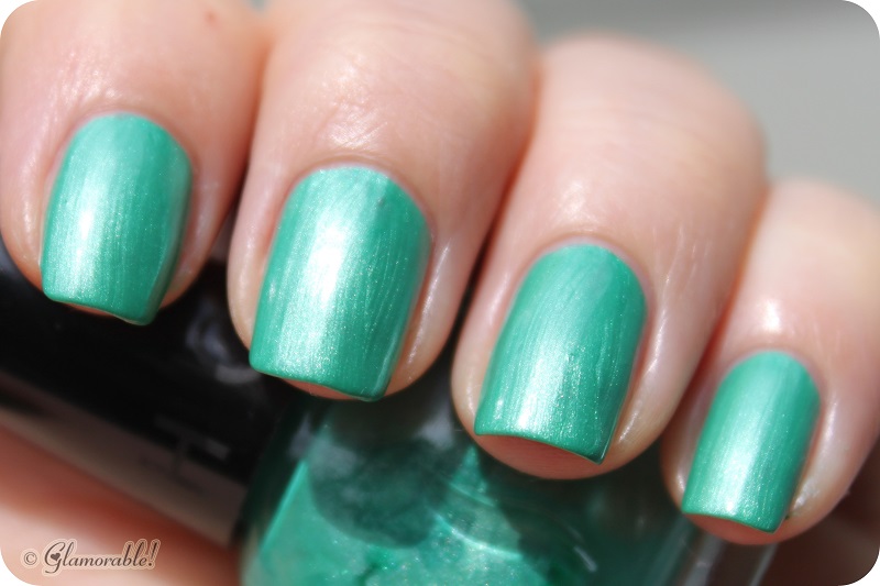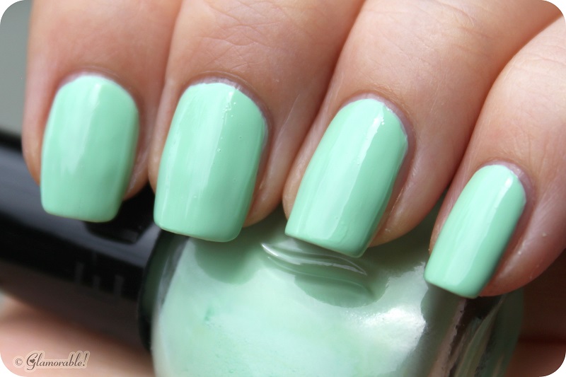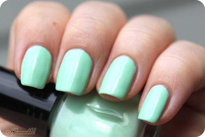 Teeny Bikini is an opaque mint sherbet creme. Coverage-wise it’s a one-coater, but since it goes on fairly streaky I needed two more coats plus a top coat to even it out. The color is cute but certainly not unique.