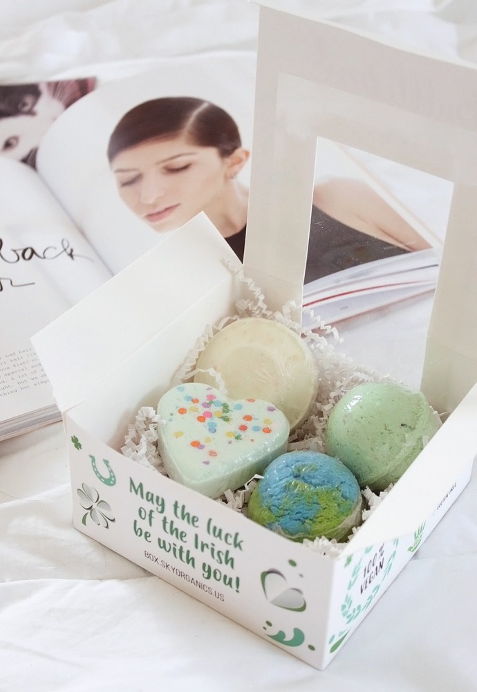 I am trying to stay on track with my monthly box reviews, but it’s been hard lately, so I’m actually pretty happy that I managed to write the review of my March Sky organics box in March, woohoo! ??? As you know, in March a lot of people worldwide observe St. Patrick’s Day – some to celebrate their cultural heritage, and others just for fun. The March box was appropriately themed Luck of the Irish, and contained four green-hued products: a bath scoop, two bath bombs, and a shower steamer. Naturally, everything smelled divine and I couldn’t wait to dig in!