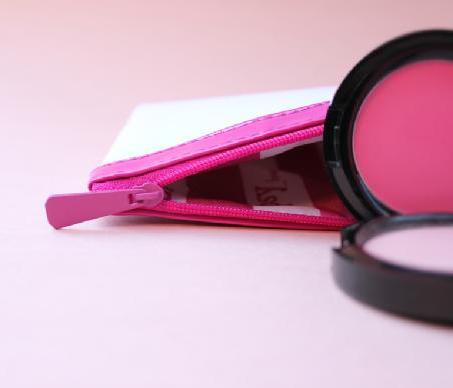 This is a spoiler of the bag itself and two other products. The bag looks like it will have a bright colored body and pink zipper lining. The other two products are obviously blushes, one in a pastel lilac pink color, other one is more of a rosy peony.
