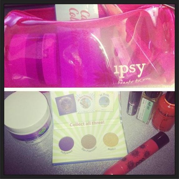 In the picture above we can clearly see a HOT PINK Ipsy makeup bag with the following products peeking out of it: