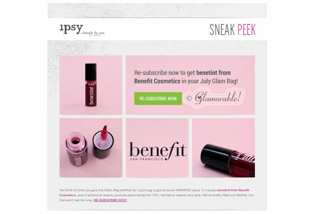 Aaaand we have our first spoiler! I just received an email on my inactive account to resubscribe for July to receive benetint from Benefit Cosmetics. It’s actually a pretty nice product that a lot of bloggers use and love, so I’m excited to receive a spare! What about you?