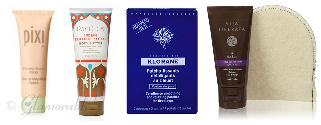 I spy Klorane Smoothing and Relaxing Patches, Pacifica Indian Coconut Nectar Body Butter, Pixi Mini Flawless Beauty Primer, and Vita Liberata Self-Tanning Lotion.