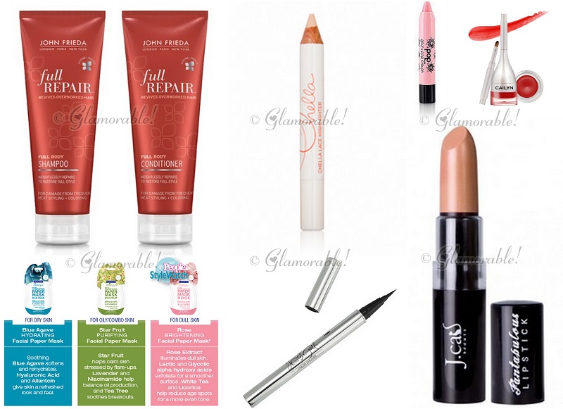 From the picture above we were able to identify several products: Cailyn Tinted Lip Balm, Chella Ivory Lace Highlighter, POP Beauty Pouty Pop Crayon, Jesse’s Girl Waterproof Eyeliner, John Frieda Full Repair Shampoo and possibly Conditioner, J. Cat Beauty Lipstick in Honey Dew, Freeman Beauty Paper Masks, skyn Iceland Hydro Cool Firming Eye Gels.