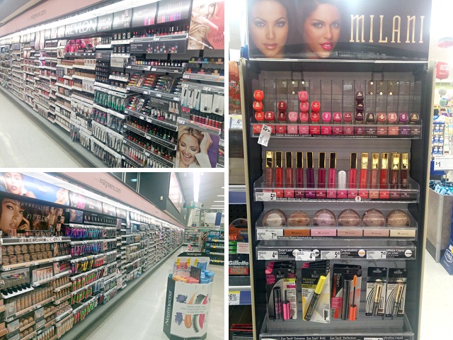 | Walgreens beauty aisle on the left; Milani stand on the right. |