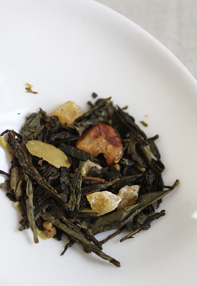 Ingredients: Chinese green tea, sencha, brittle, coconut rasps, candied pineapple, walnuts, natural coconut flavor, almonds.
