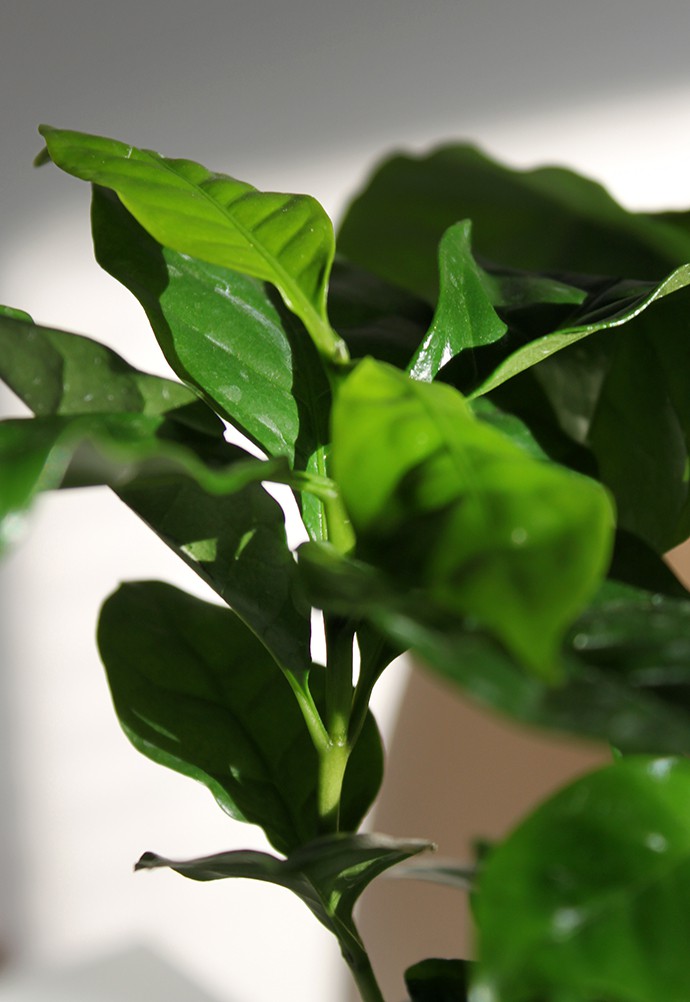 - When the plant is healthy, Coffea leaves have a polished look and a beautiful glossy sheen.