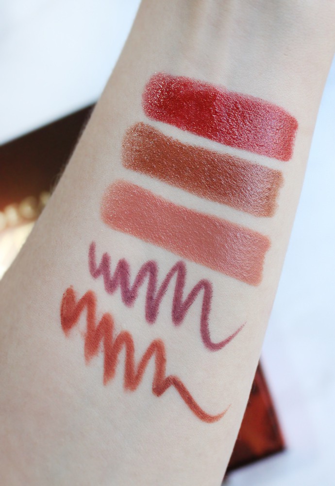 More swatches! Top to Bottom: Urban Decay Naked Heat Vice Lipstick Heat, Scorched, Fuel; Urban Decay Naked Heat 24/7 Glide-On Eye Pencils Alkaline, Torch.
