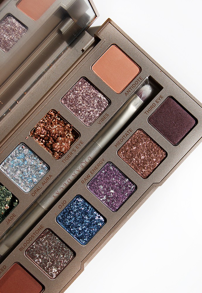The palette contains a new experimental formula that UD calls “marbleized shimmers”. These new shimmers feel bouncy and creamy to touch, it’s as if the glittery pigments were suspended in a creamy gel base. They are meant to be applied with your fingertips and built up to the desired opacity – for the most intense color payoff, UD recommends using matching Stoned Vibes eye pencils as a base. To diffuse the edges, the brand suggests using the included brush, although, in my experience, fingers worked best. Additionally, the palette also comes with a few standard matte and satin pans to complement the new formula.