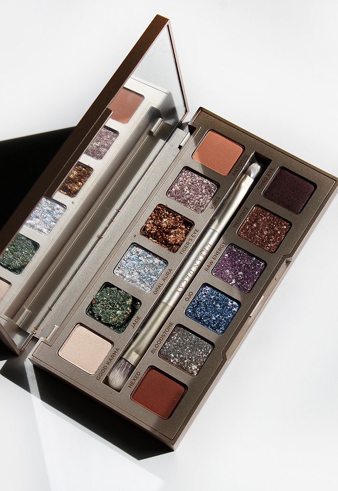 According to Urban Decay, Soned Vibes is a “vegan eyeshadow palette packed with 12 all-new mood-shifting shimmery shades infused with genuine tourmaline to block bad energy and elevate your look.” See that bolded part? That’s where I did a giant eye roll. Urban Decay has always welcomed alternative trends but in my opinion, this whole crystal-energy-auras-manifesting thing screamed more attention-seeking than genuine.