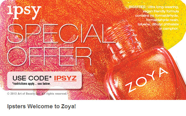 Zoya and Ipsy have created a special promotion just for the nail polish addict that has to have the latest and greatest. From May 1, 2013 – May 31, 2013 Ipsters using the code IPSYZ will get the following special offer: